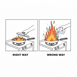 - Water is Not the Answer (The “Oil Explosion”): This is the most dangerous mistake. Oil is lighter than water. When you throw water on a grease fire, the water sinks to the bottom, boils instantly, and turns into steam. This steam expands violently, “exploding” the burning oil into a thousand tiny droplets that fill the room. If a grease fire occurs, stay calm and slide a metal lid over the pan or use a damp fire blanket to smother the flames—never use water.